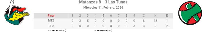 Los matanceros anotaron tres veces en el segundo inning y cinco en el tercero para explotar al abridor tunero y a la postre perdedor del juego Eliander Bravo. Además de ataque ofensivo de 13 imparables contaron con las deficiencias de la defensa tunera que le regaló dos carreras sucias.