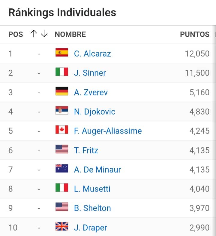 Completan la prestigiosa lista de los diez mejores del mundo Lorenzo Musetti, de Italia; Ben Shelton, de Estados Unidos y el británico Jack Draper, en ese orden.