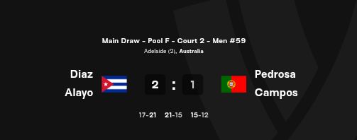 La dupla cubana de Noslen Díaz y Jorge Luis Alayo clasificó a los dieciseisavos de final del Campeonato Mundial de Voleibol de Playa con sede en Adelaida, Australia. Los nuestros derrotaron a la difícil pareja portuguesa de Pedrosa y Campos.
