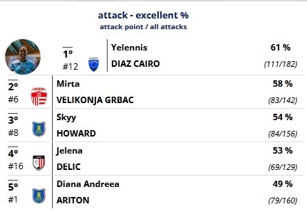 También destaca Yelennis Díaz Cairo, líder atacadora en el campeonato de Rumanía con una efectividad del 61%, además de ubicarse cuarta en el apartado de bloqueo. En la propia lid rumana Yensy Kindelán es la segunda máxima anotadora con 235 puntos (4,2 por set).