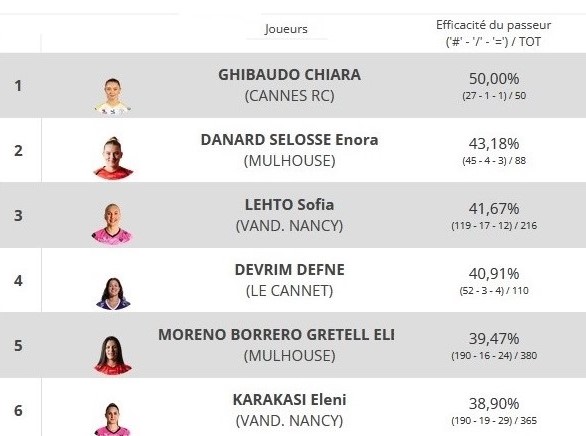 La pasadora Gretel Moreno continúa su paso estable como acomodadora titular del club Mulhouse en la Liga de Francia, y se ubica en el quinto lugar por su rendimiento integral entre todas las colocadoras del certamen.