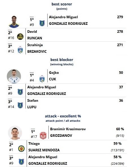 En la trinchera contraria Thiago Suárez anotó 9, incluidos 3 muros. Tuvo una excelente efectividad de ataque del 63%, ratificándose como segundo en ese departamento en la justa rumana.