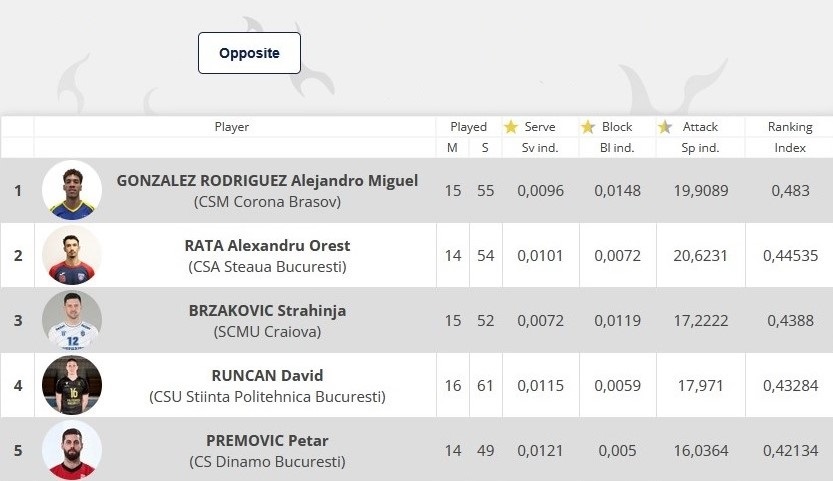El joven voleibolista cubano Alejandro Miguel González sigue sobresaliendo en la Liga de Rumanía, y encabeza varios departamentos individuales al término de la jornada 17 del certamen.