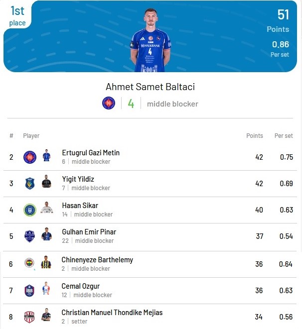 Además, consiguió 5 bloqueos y en ese apartado se reafirmó como el octavo mejor de todo el campeonato con 34 acciones positivas, una brillante actuación teniendo en cuenta el buen nivel de la Efelerligi y que comparte el listado de bloqueadores con estelares jugadores centrales.